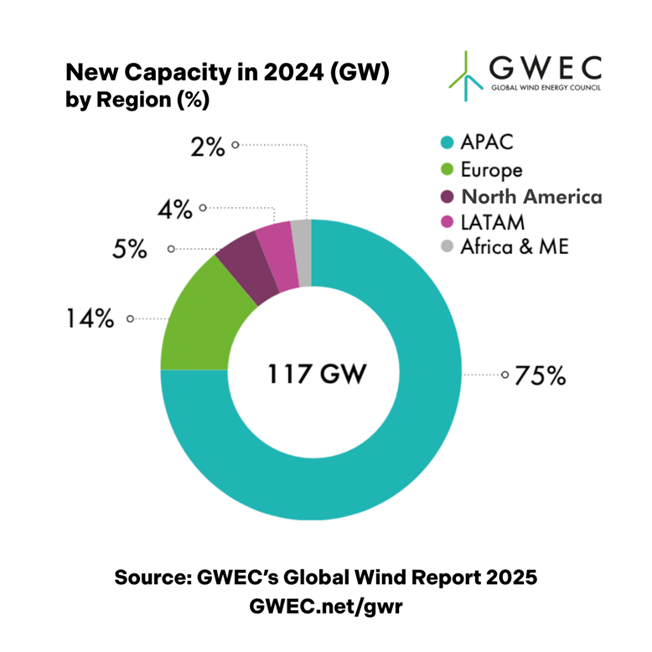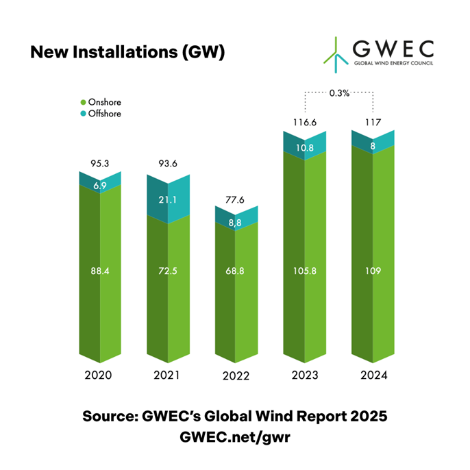 《2025年全球风能报告》包括来自世界各个地区的数据。去年的增长——新增陆上风电109 GW和海上风电8 GW——使全球风能累计装机容量达到1,136GW,遍布各大洲,去年有55个国家和地区安装了风电机组。