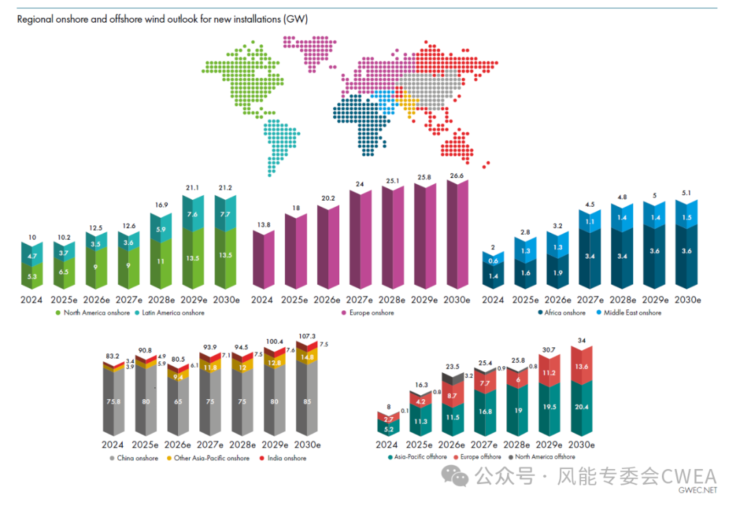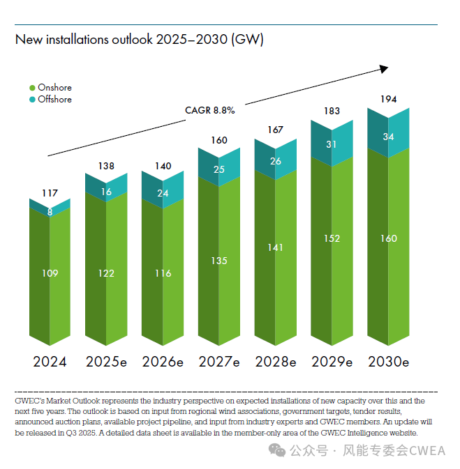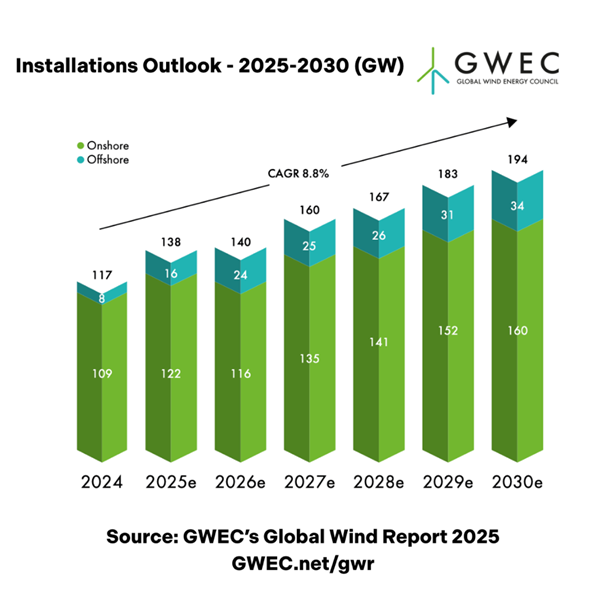 该报告预测,风能行业未来的复合年平均增长率为8.8%,这意味着到2030年,全球风能容量将增加981 GW。GWEC的市场情报服务预计,到2030年,新装机容量将连续创下历史新高,2025年新增装机容量为138 GW,2026年为140 GW,2027年为160 GW,2028年为167 GW,2029年和2030年分别跃升至183 GW和194 GW。