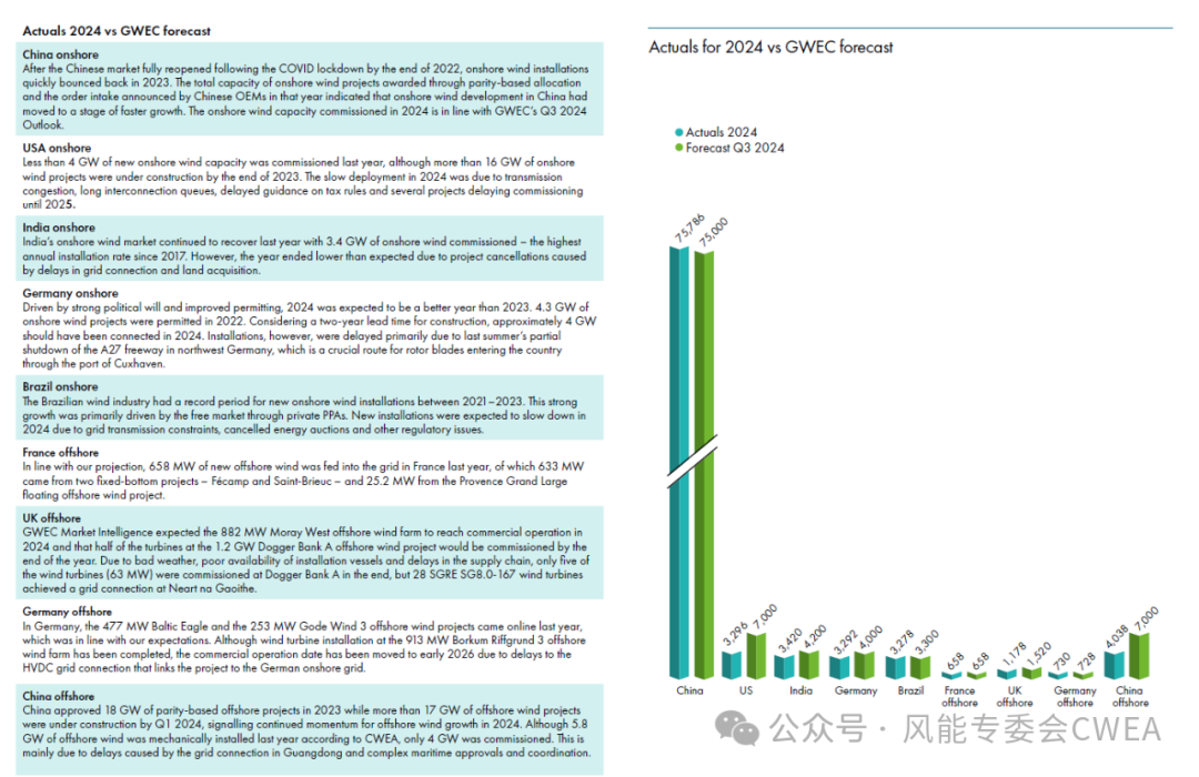 GWEC指出,尽管2024年是风电装机量创纪录的一年,但总体数据掩盖了全球市场的巨大差异,其中大部分装机量发生在包括中国和欧洲在内的少数成熟市场。