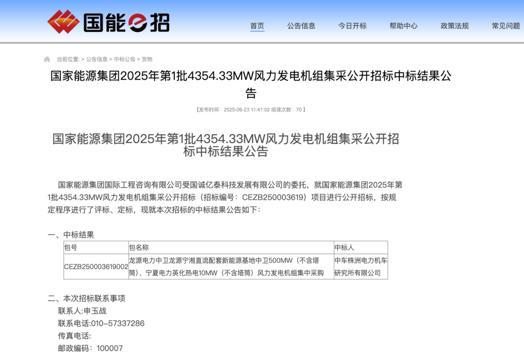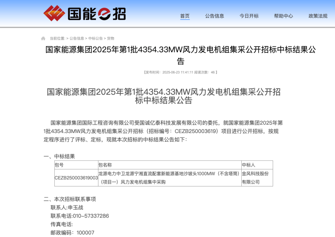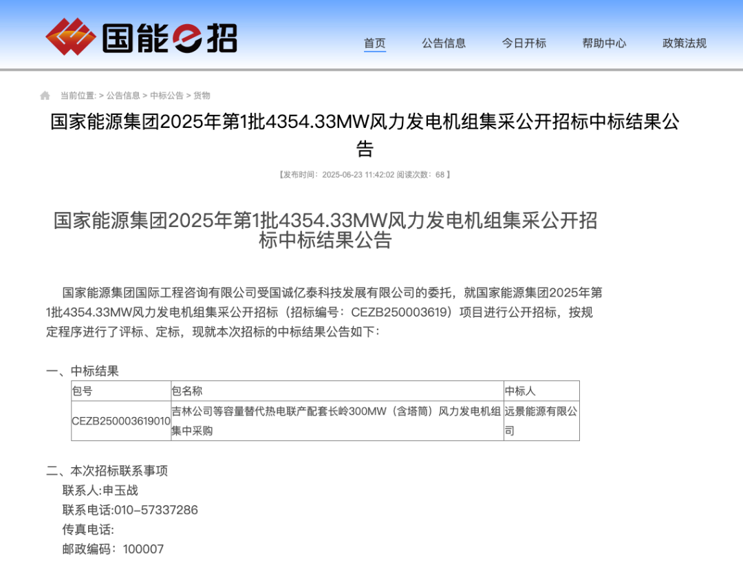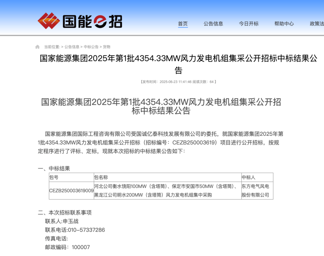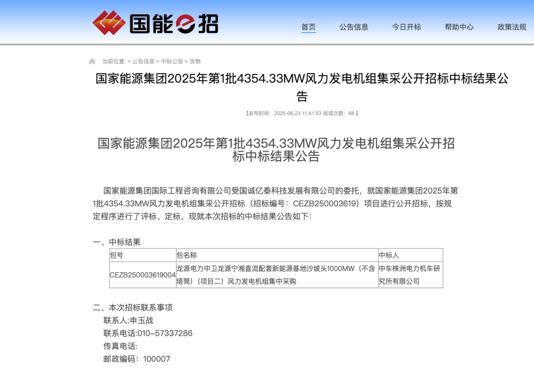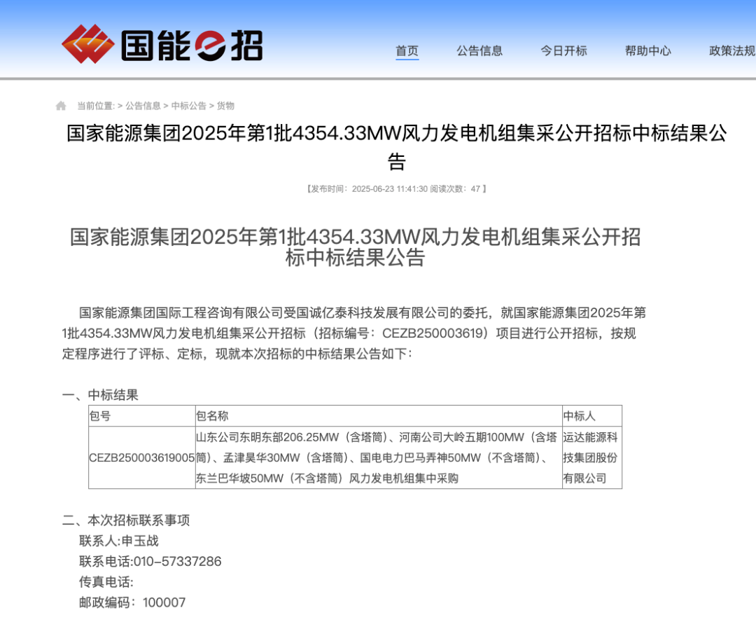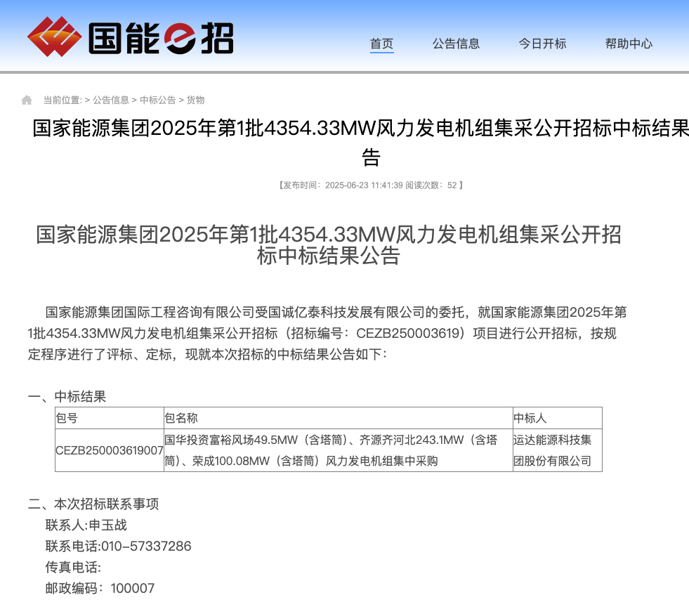 风电头条获悉,6月23日,国家能源集团2025年第1批4354.33MW风力发电机组集采公开招标中标结果公告。