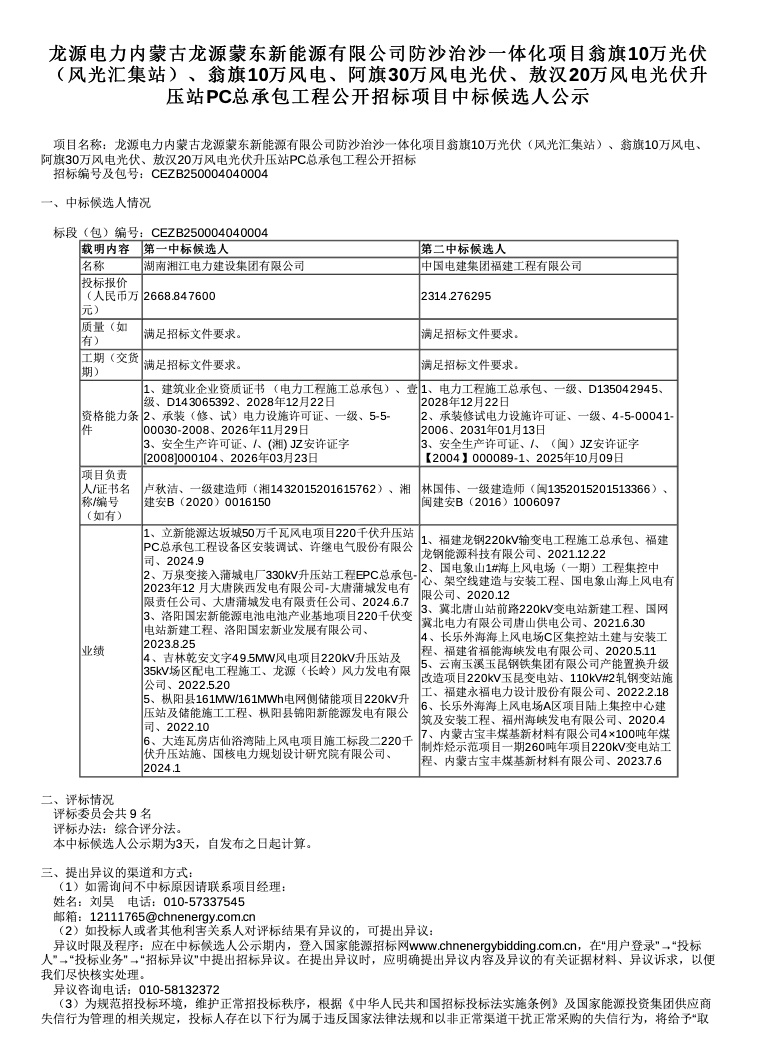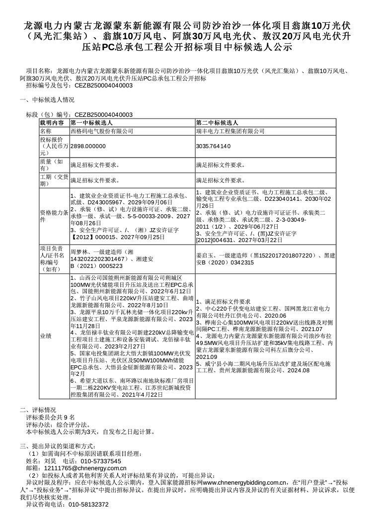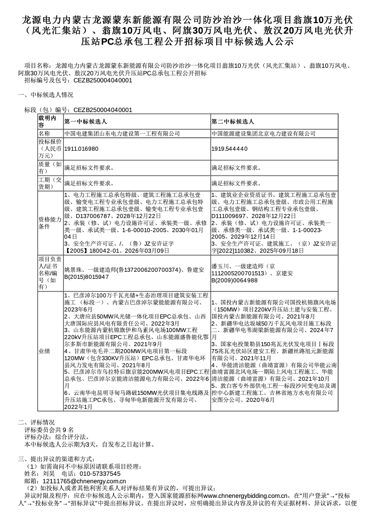 风电头条6月25日获悉,国能e招官网发布一组PC总承包风光治沙项目中标候选人结果。