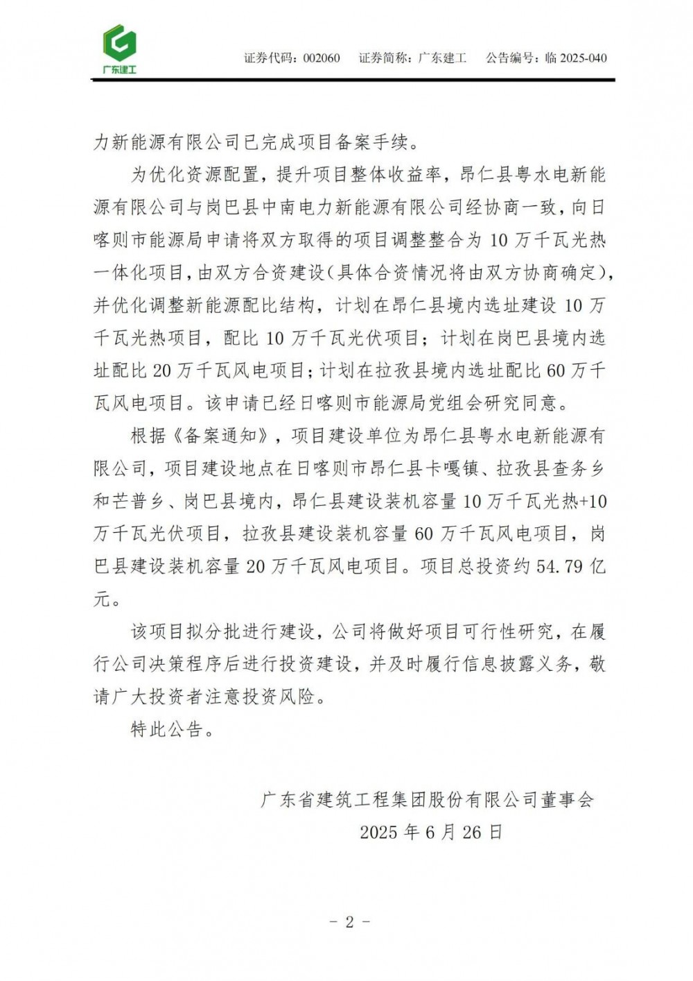 6月26日,广东省建筑工程集团股份有限公司发布关于取得西藏日喀则市10万千瓦光热 +10万千瓦光伏+80万千瓦风电一体化项目备案的公告。