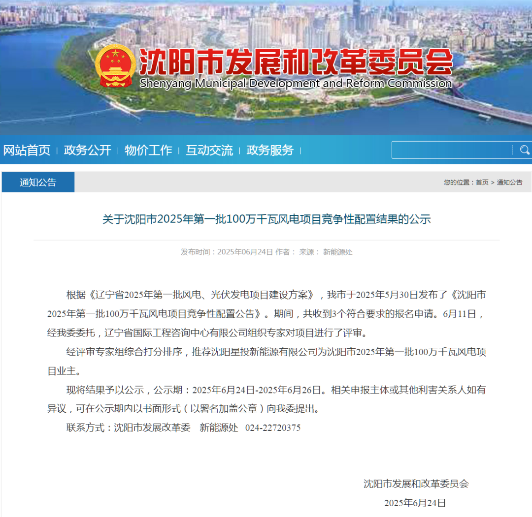 6月24日,辽宁沈阳市2025年第一批100万千瓦风电项目竞争性配置结果公示,经评审专家组综合打分排序,推荐沈阳星投新能源有限公司为沈阳市2025年第一批100万千瓦风电项目业主。