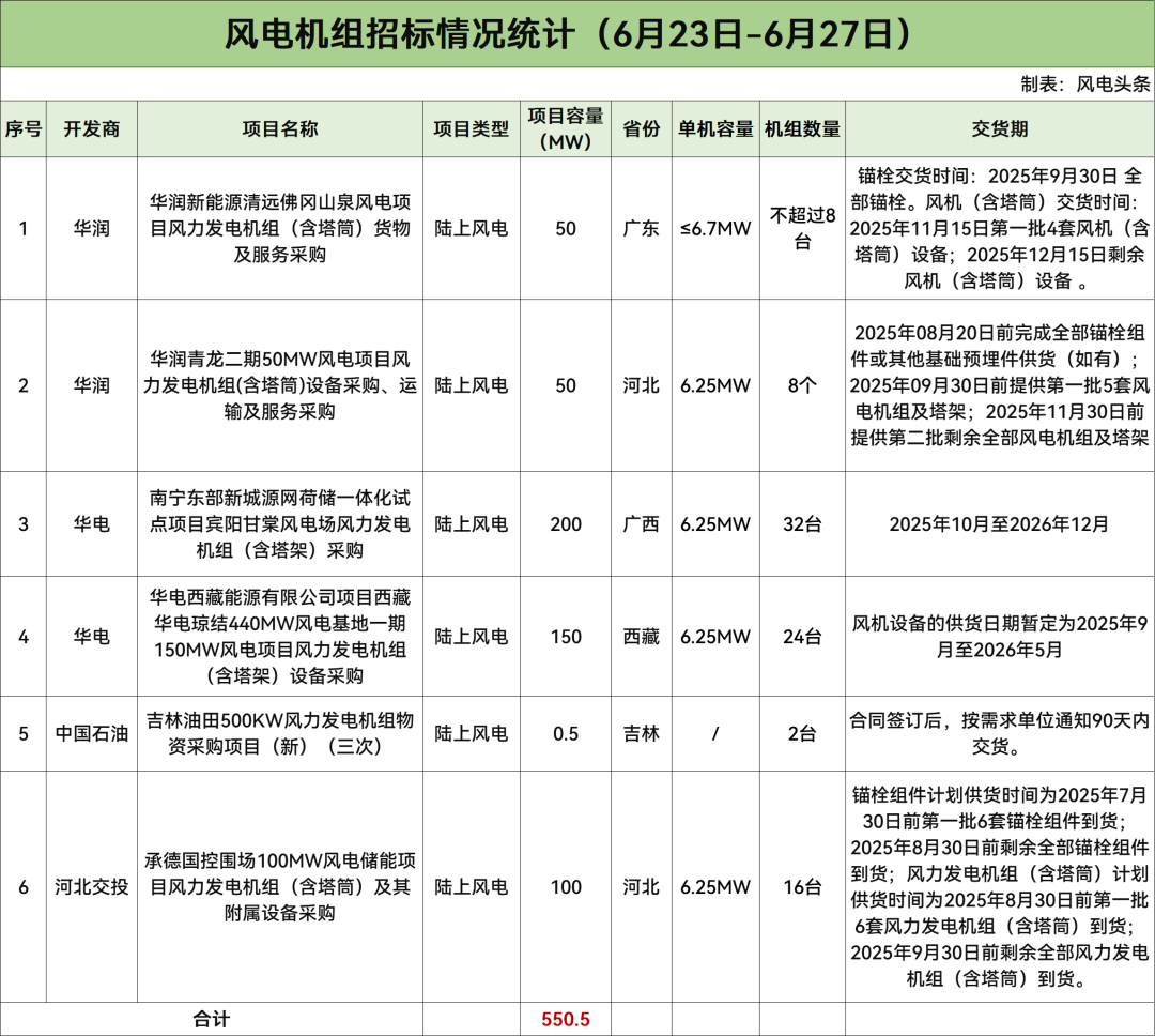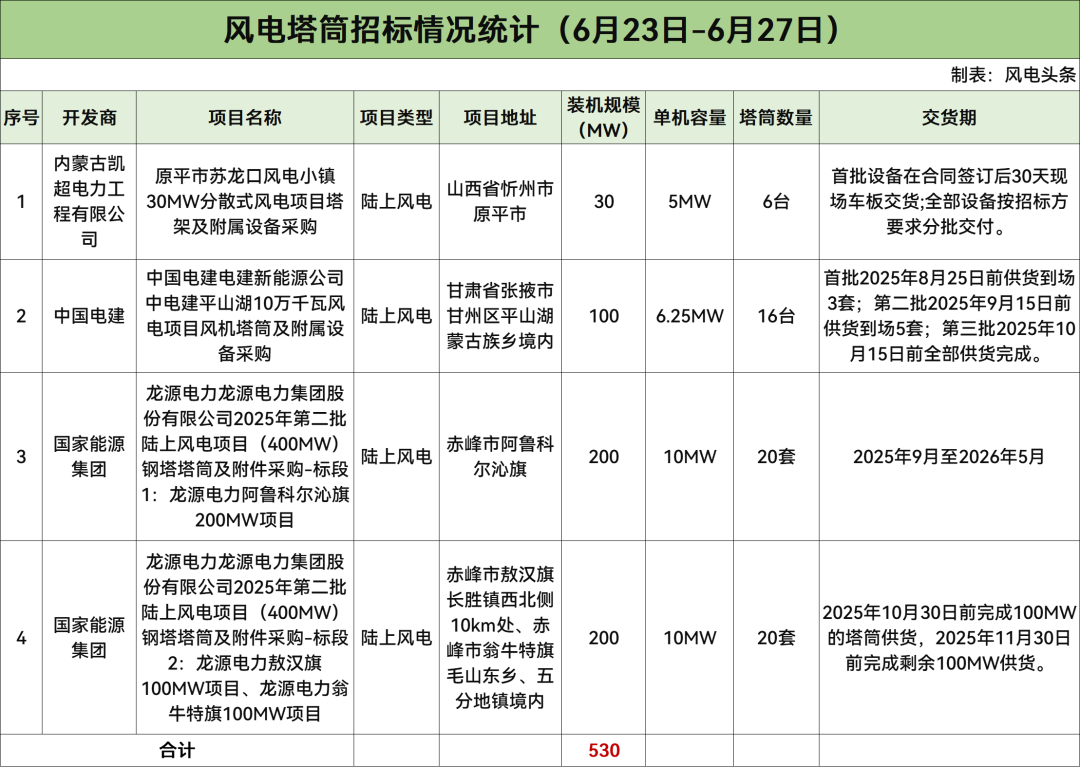 据风电头条统计,6月23日-6月27日风电整机采购开标总计1653.75MW,风电机组招标总计550.5MW;风电塔筒开标总计278.98MW,风电塔筒招标总计530MW。