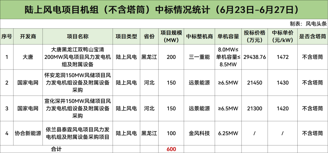 大唐开标850MW,中车株洲所中标600MW,三一重能中标200MW,远景能源中标50MW。