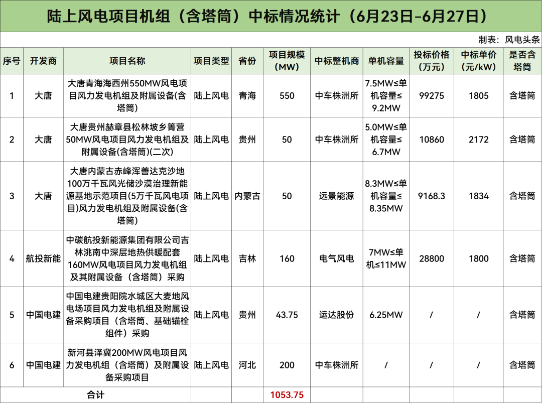 据风电头条统计,本周含塔筒陆上风电项目共计6个,规模总计1053.75MW,项目中标均价为1903元/kW。