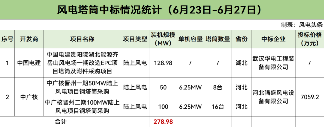 据风电头条统计,本周有2个陆上风电项目塔筒采购开标,规模为278.98MW,开发商为中国电建、中广核。