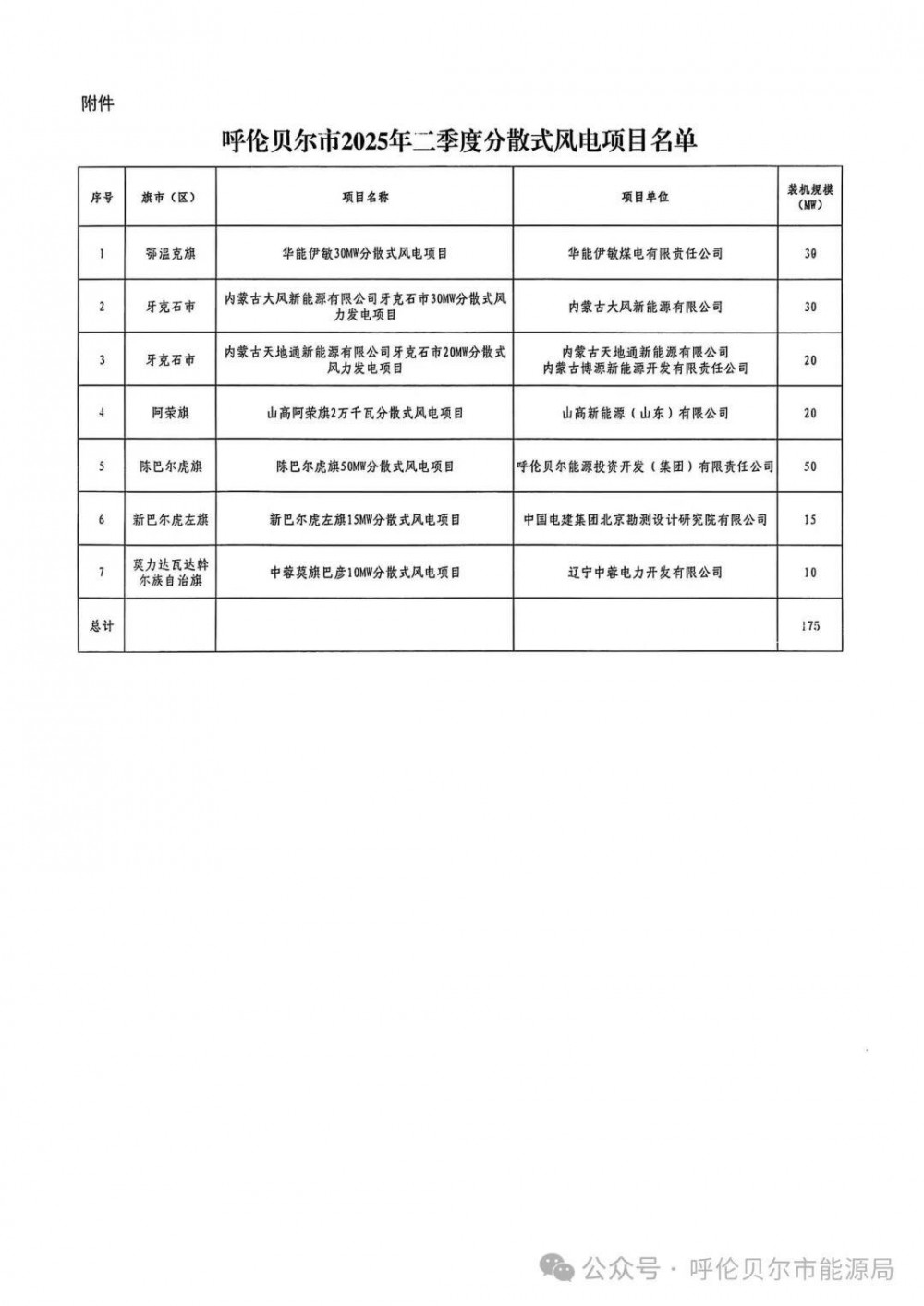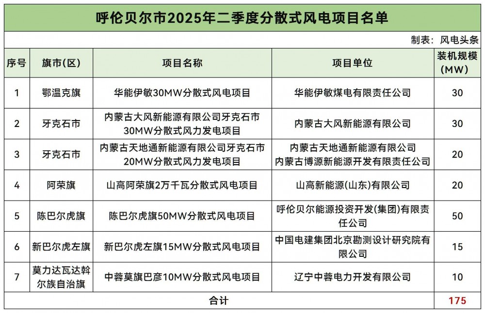 公示显示,共有7个项目入选名单,规模合计175MW。项目分布在牙克石市、陈巴尔虎旗、鄂温克旗、阿荣旗、新巴尔虎左旗、莫力达瓦达斡尔族自治旗等多个地区。