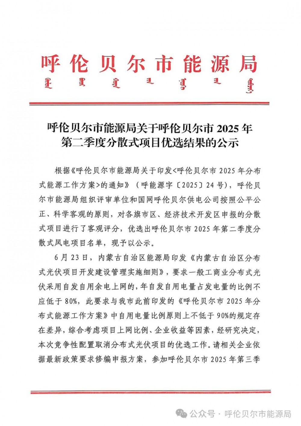 6月27日,呼伦贝尔市能源局发布关于呼伦贝尔市2025年第二季度分散式项目优选结果的公示。