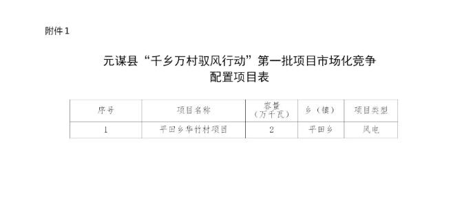 元谋县列入云南省“千乡万村驭风行动”第一批项目开发方案的1个风电项目,装机容量2万千瓦进行市场化竞争配置(详见附件1)。