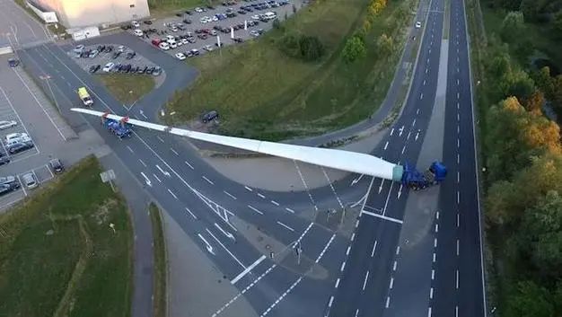 公路运输是目前风电叶片最常用的运输方式。它具有灵活性高、可达性强的优点,能够直接将叶片运输到风电场现场。为了适应风电叶片的超长尺寸,通常会采用特殊的运输车辆,如配备可调节支架和转向系统的平板拖车。在运输过程中,还需要对道路进行详细勘察,提前清除障碍物,确保车辆能够顺利通行。