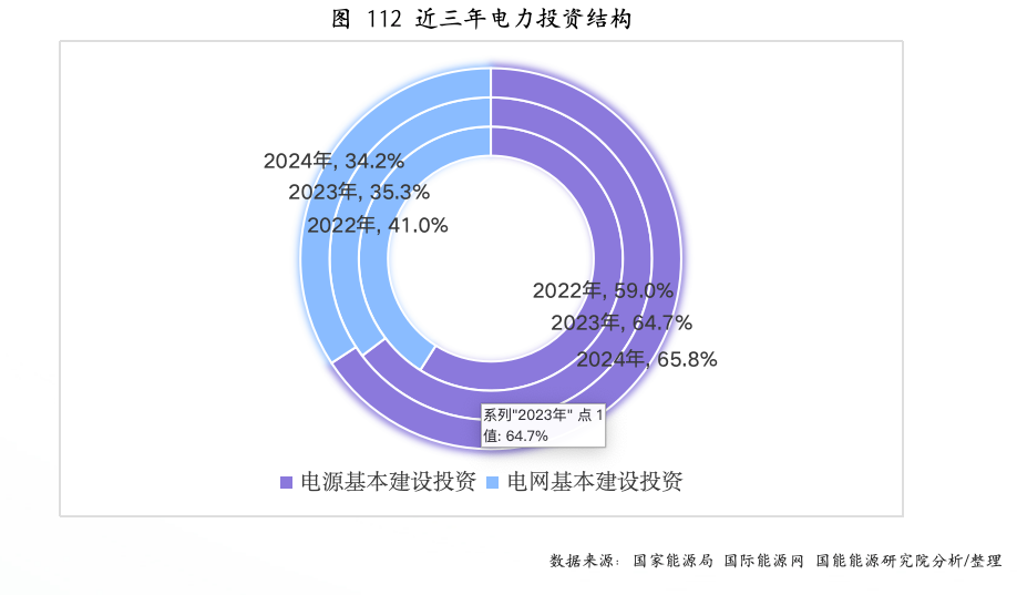2024年全国电源基本建设投资占电力投资比重的65.8%,较上一年增加1.1%;电网基本建设投资占电力投资的比重为34.2%,较上一年降低1.1%。随着新能源产业的加速发展,风能、太阳能等非化石能源装机规模快速增长,同时,新能源汽车充电桩、充电站等新兴领域需求将增大,带动上下游及电网企业投资的持续增长。
