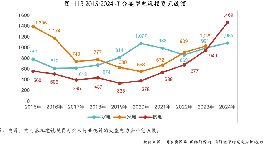 2024年主要发电企业电源工程完成投资11687亿元,同比增长12.1%。其中水力电源工程建设投资完成额为1085亿元,同比增长9.5%,占电源投资的比重为9.3%;核电工程建设投资完成额为1469亿元,同比增长54.8%,占电源投资的比重为8.1%。