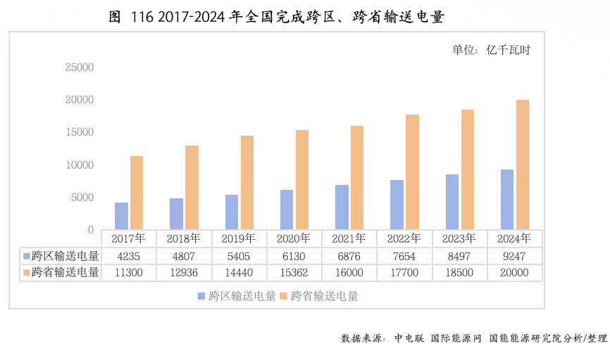 2024年,全国完成跨省输送电量2.0万亿千瓦时,同比增长7.1%,其中内蒙古、云南、山西、四川、新疆五个省份的净输出电量规模超过1000亿千瓦时。