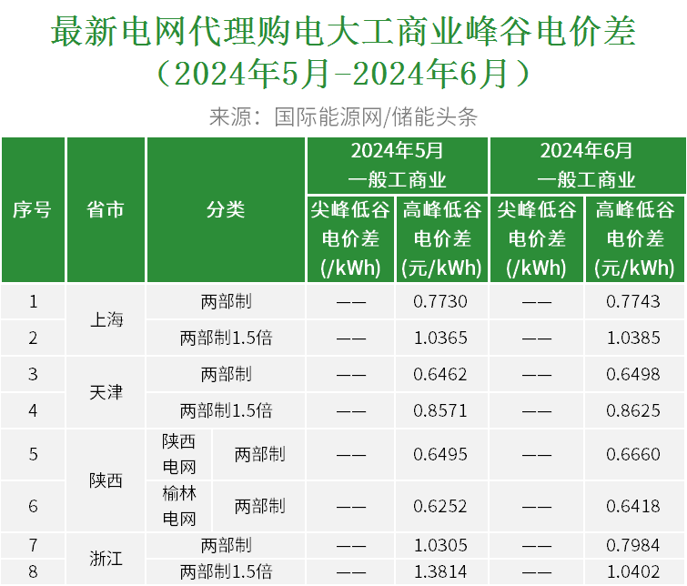 据悉,了解到,2024年6月电网代理购电价格中,全国峰谷价差最高的是广东珠三角五市,执行一般工商业单一制尖峰电价时,峰谷价差为1.3066元/kWh,比5月最高价格低0.544元/kWh。
