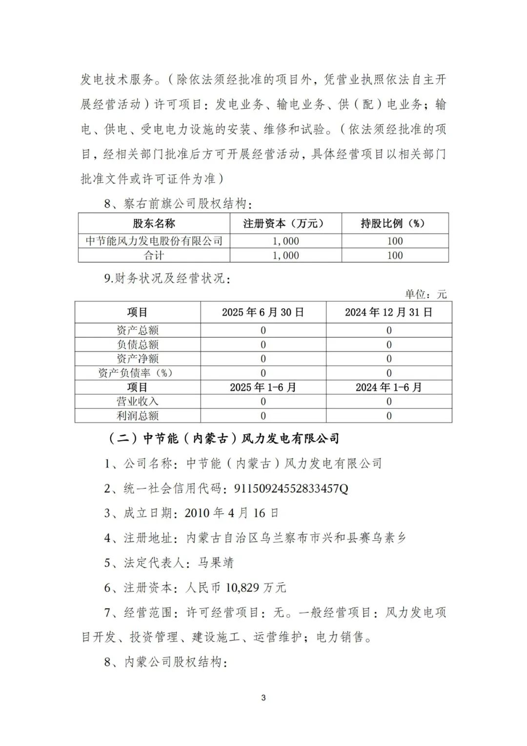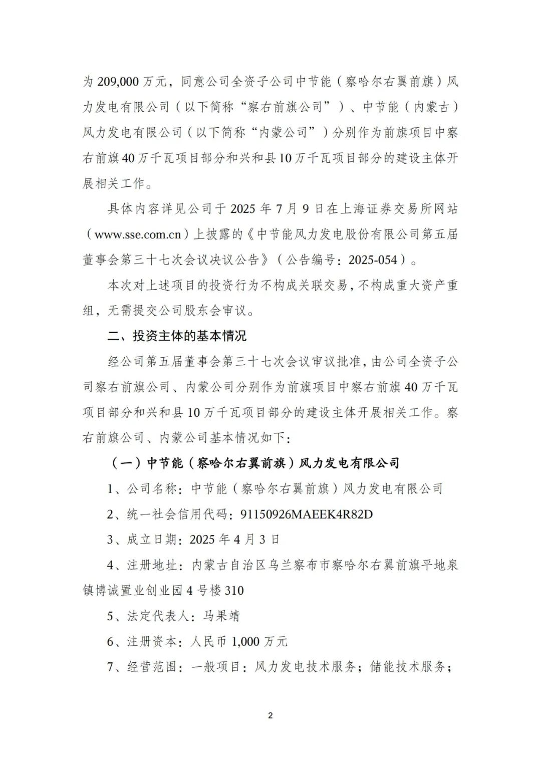 同意公司全资子公司中节能(察哈尔右翼前旗)风力发电有限公司(以下简称“察右前旗公司”)、中节能(内蒙古)风力发电有限公司(以下简称“内蒙公司”)分别作为前旗项目中察右前旗40万千瓦项目部分和兴和县10万千瓦项目部分的建设主体开展相关工作。
