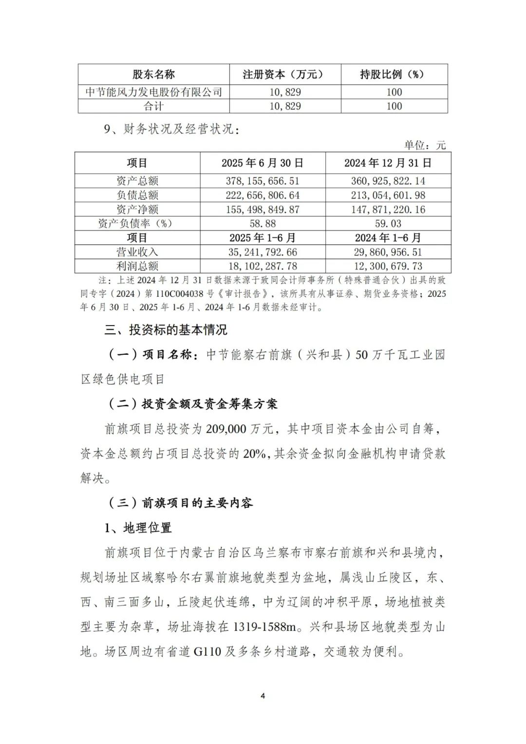 公告显示,公司审议通过了《关于投资建设中节能察右前旗(兴和县)50万千瓦工业园区绿色供电项目的议案》,同意投资建设前旗项目,前旗项目包含察右前旗部分40万千瓦项目和兴和县部分10万千瓦项目,项目总投资为209,000万元。