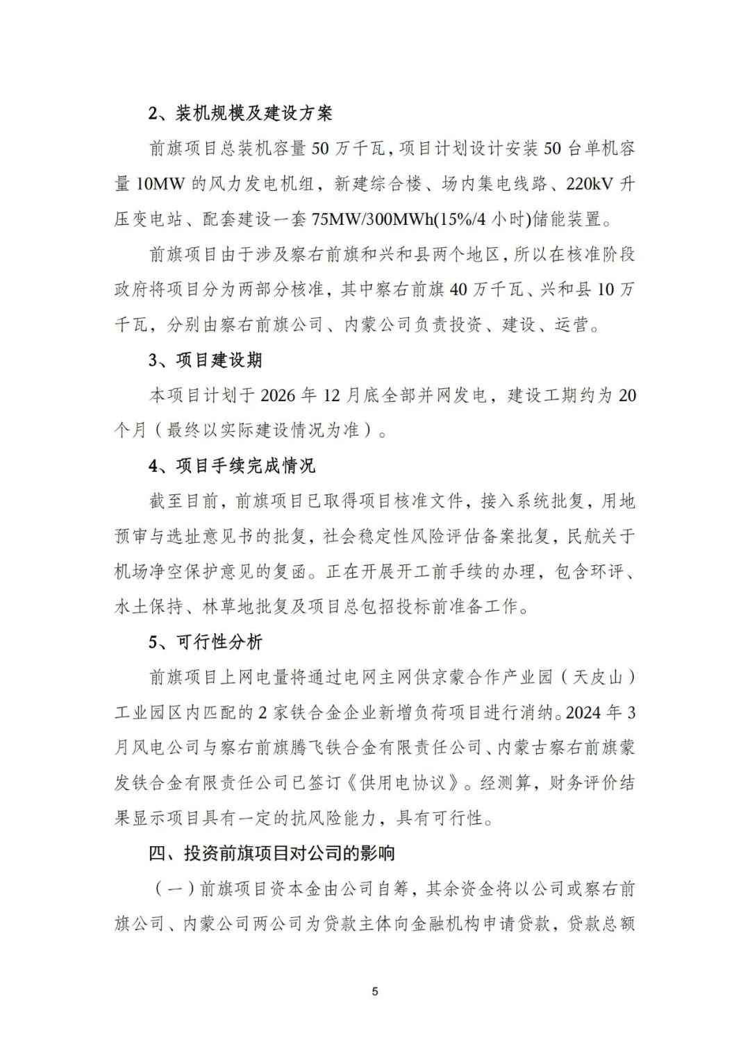 前旗项目上网电量将通过电网主网供京蒙合作产业园(天皮山)工业园区内匹配的2家铁合金企业新增负荷项目进行消纳。2024年3月风电公司与察右前旗腾飞铁合金有限责任公司、内蒙古察右前旗蒙发铁合金有限责任公司已签订《供用电协议》。