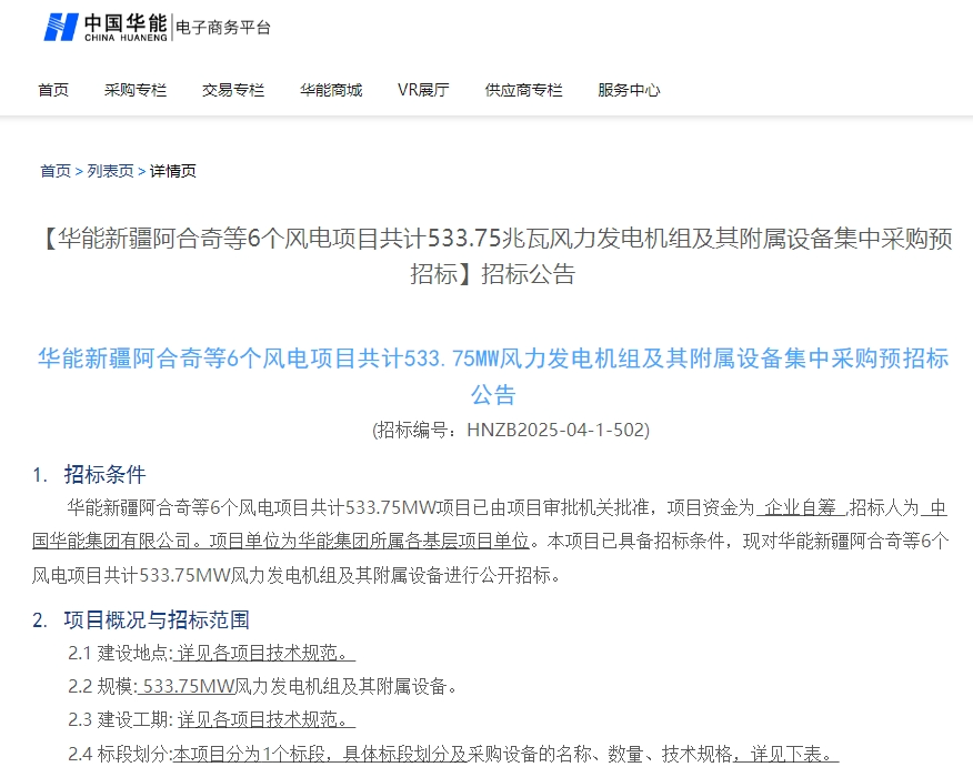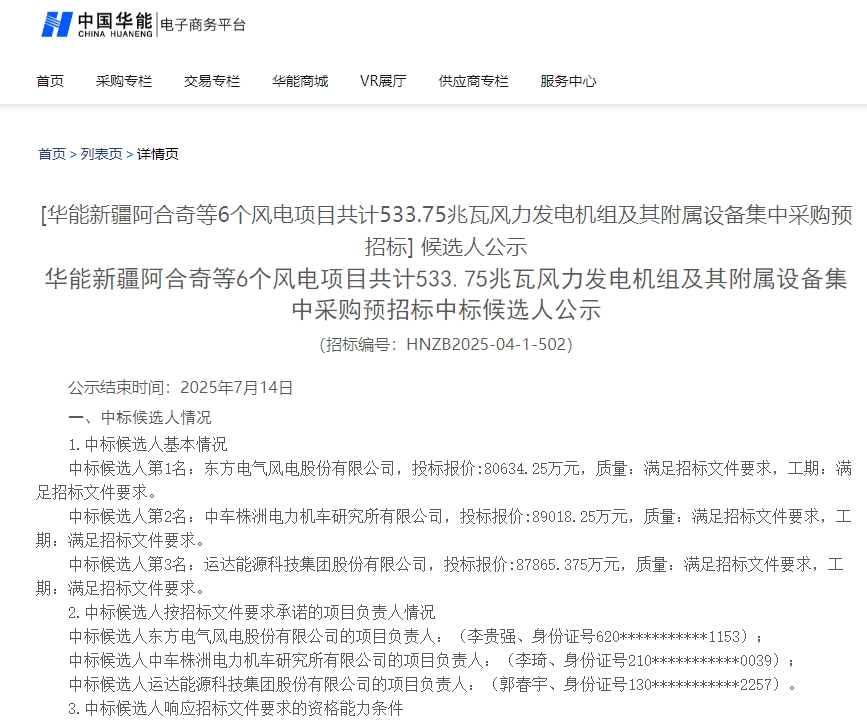 风电头条获悉,7月11日,华能电子商务平台公示6个风电项目中标结果。有三家公司成功入围。