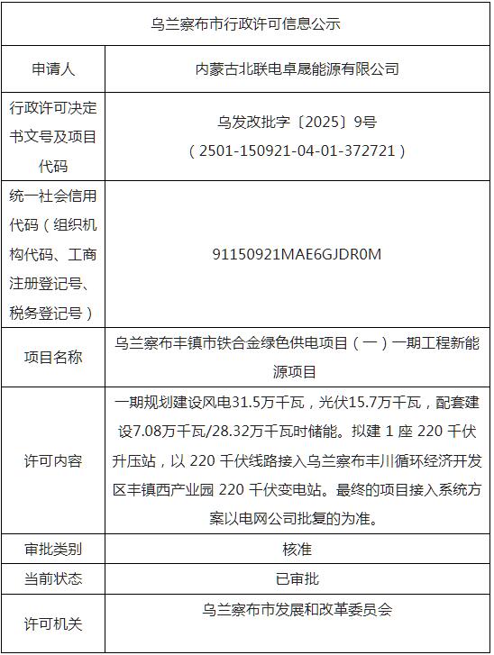 乌兰察布丰镇市铁合金绿色供电项目(一)一期工程新能源项目一期规划建设风电31.5万千瓦,光伏15.7万千瓦,配套建设7.08万千瓦/28.32万千瓦时储能。拟建 1 座 220 千伏升压站,以 220 千伏线路接入乌兰察布丰川循环经济开发区丰镇西产业园 220 千伏变电站。最终的项目接入系统方案以电网公司批复的为准。