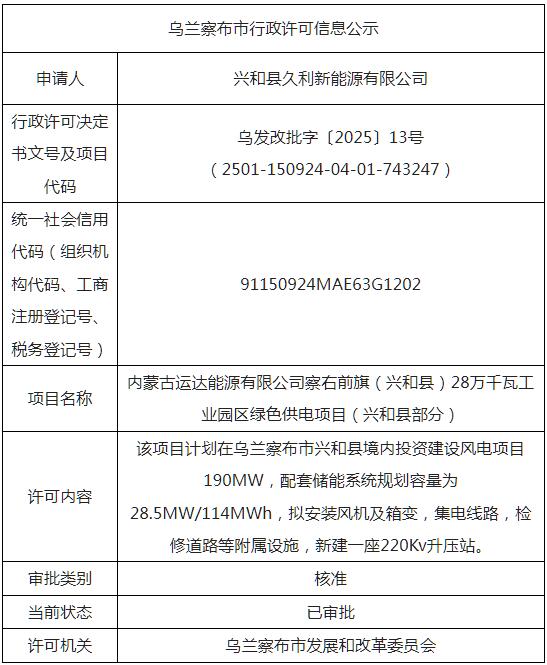 内蒙古运达能源有限公司察右前旗(兴和县)28万千瓦工业园区绿色供电项目(兴和县部分)装机规模38万千瓦,其中风电28万千瓦,光伏发电10万千瓦,配套建设5.75万千瓦/4小时储能、220千伏升压站1座,以及进场道路、检修道路、箱变、集电线路等附属设施。