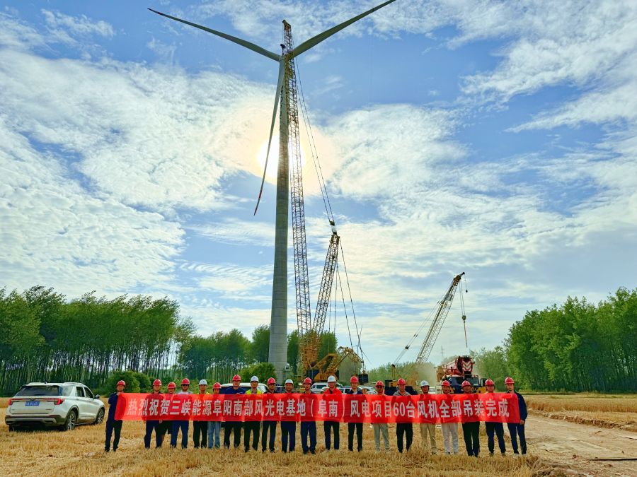 该项目风电部分由颍上25万千瓦、阜南30万千瓦风电项目构成,是三峡集团首个自建轮毂高度160米钢混塔风电项目,共安装110台5兆瓦风电机组,对探索风电机组的大型化发展以及高切变地区风能资源的有效开发利用具有积极推动作用。风电项目作为安徽阜阳基地项目的重要组成部分,全面投产后,预计年平均上网发电量约12亿千瓦时,每年可节约标准煤约38万吨,减少二氧化碳排放量约105万吨,为长三角地区经济发展和能源结构优化提供强劲动力。