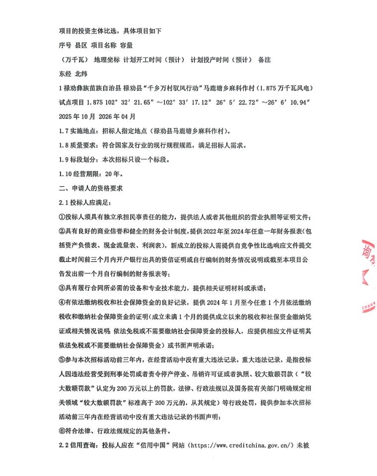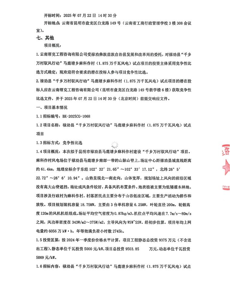7月15日,云南禄劝县“千乡万村驭风行动”马鹿塘乡麻科作村(1.875万千瓦风电)试点项目竞争性比选公告发布。