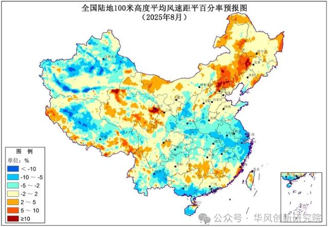 图1.2 2025年8月全国陆地100米高度平均风速距平百分率预报图