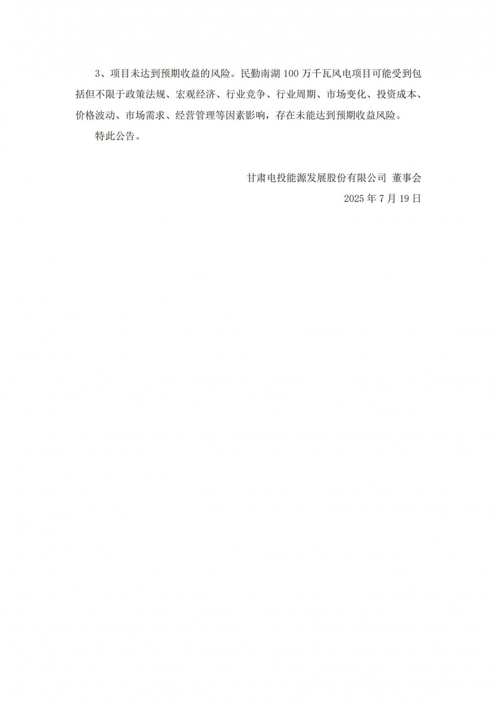 7月19日,甘肃电投能源发展股份有限公司发布关于腾格里沙漠大基地 600 万千瓦新能源项目中民勤南湖 100 万千瓦风电项目获得核准的公告。