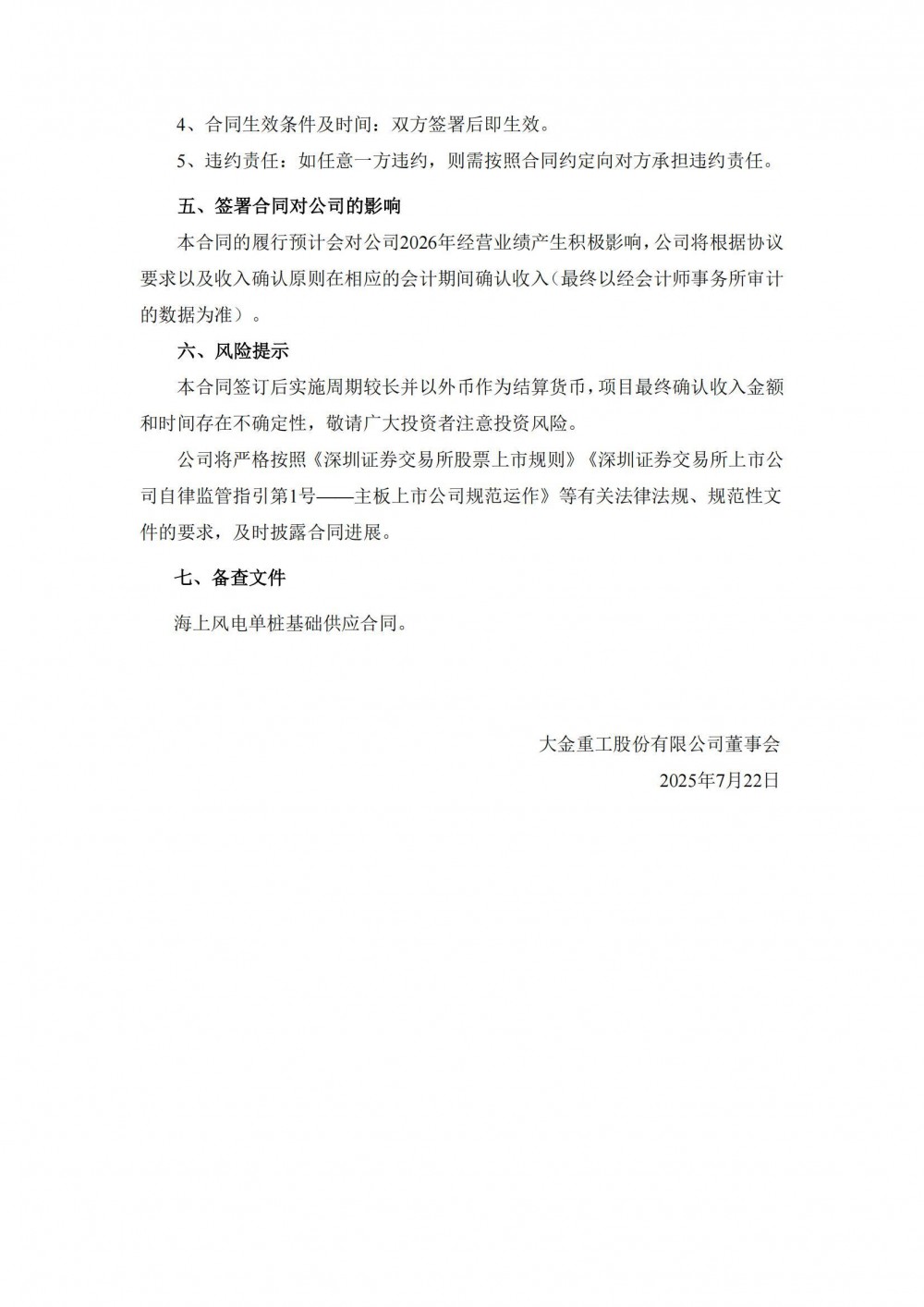 7月22日,大金重工股份有限公司发布关于签署欧洲某海上风电场单桩基础供应合同的公告。