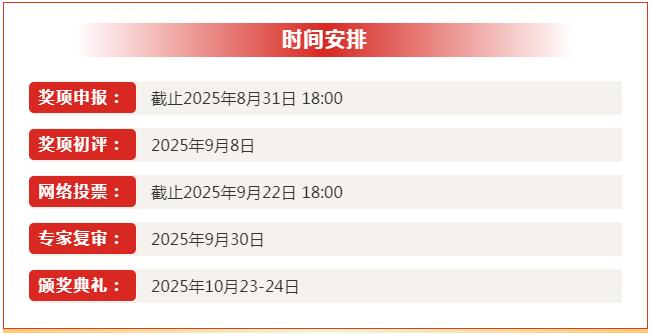 采用“在线申报 → 奖项初评 → 网络投票 → 专家复审”的评审流程。