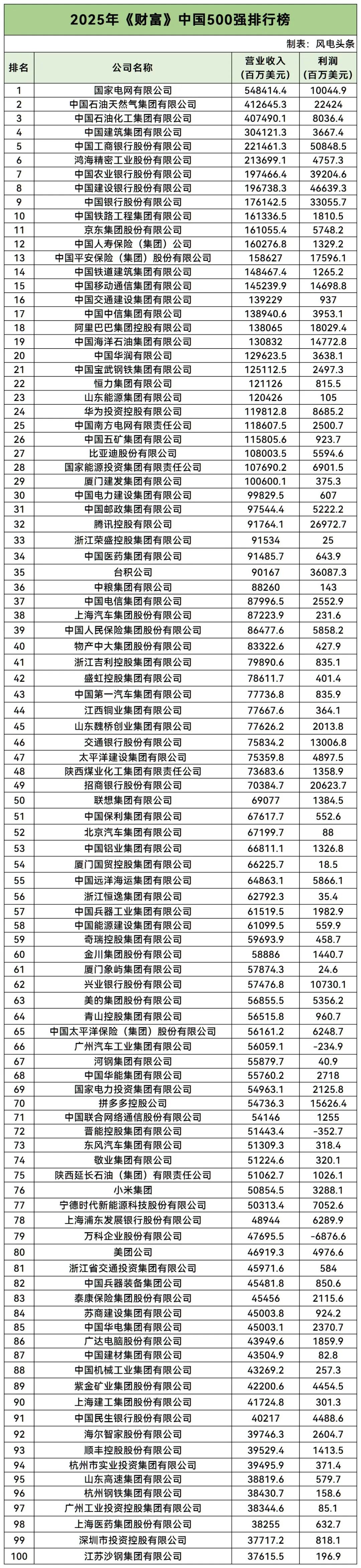其中,国家电网有限公司以5,484亿美元的营收位居榜首,中国石油和中国石化分列榜单第二位和第三位,位列第四位的是中国建筑集团,中国工商银行位列第五。