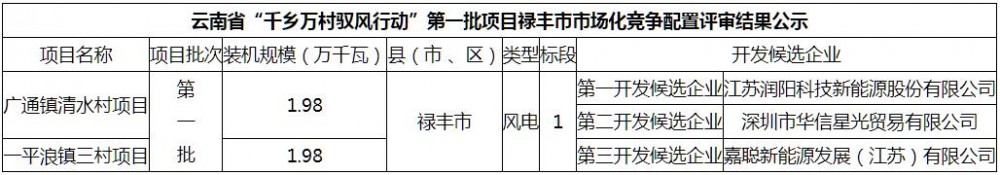 根据公示,广通镇清水村项目、一平浪镇三村项目第一开发候选企业为江苏润阳科技新能源股份有限公司,第二开发候选企业为深圳市华信星光贸易有限公司,第三开发候选企业为嘉聪新能源发展(江苏)有限公司。