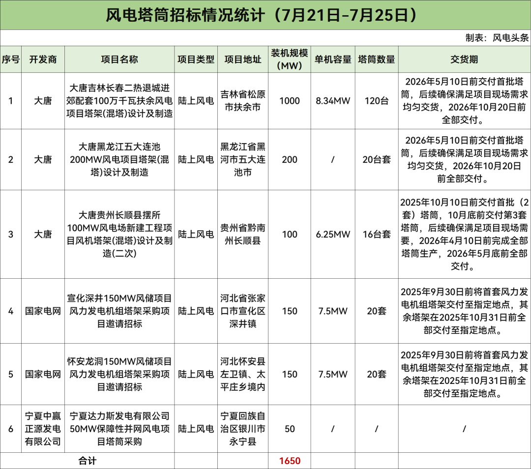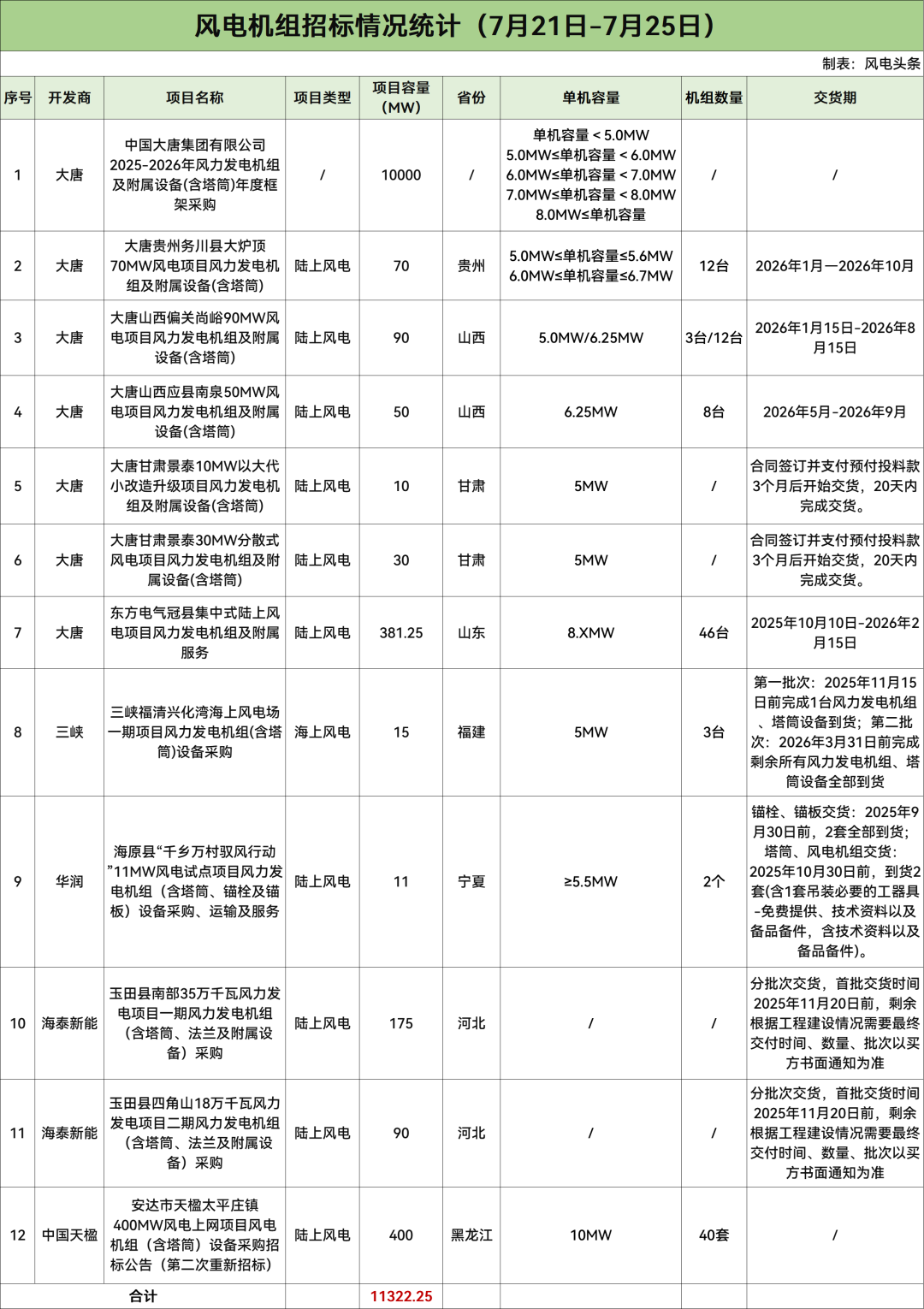 据新能源圈统计,7月21日-7月25日风电整机采购开标总计1706.7MW,风电机组招标总计11322.25MW;风电塔筒开标总计100MW,风电塔筒招标总计1650MW。