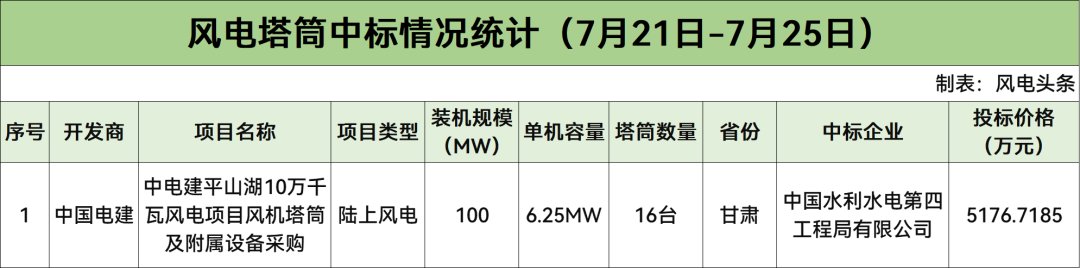 据新能源圈统计,本周有1个陆上风电项目塔筒采购开标,规模为100MW,开发商为中国电建。