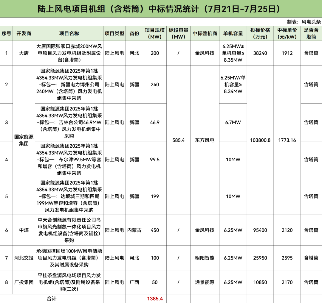 据新能源圈统计,本周含塔筒陆上风电项目共计8个,规模总计1385.4MW,项目中标均价为2114.03元/kW。