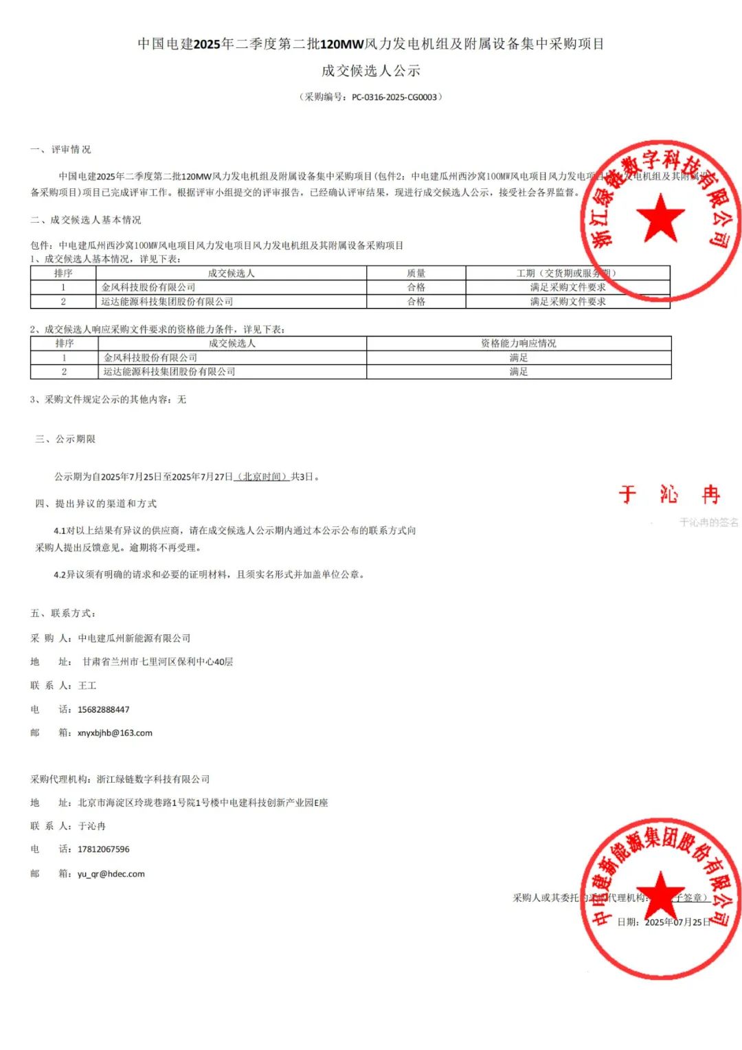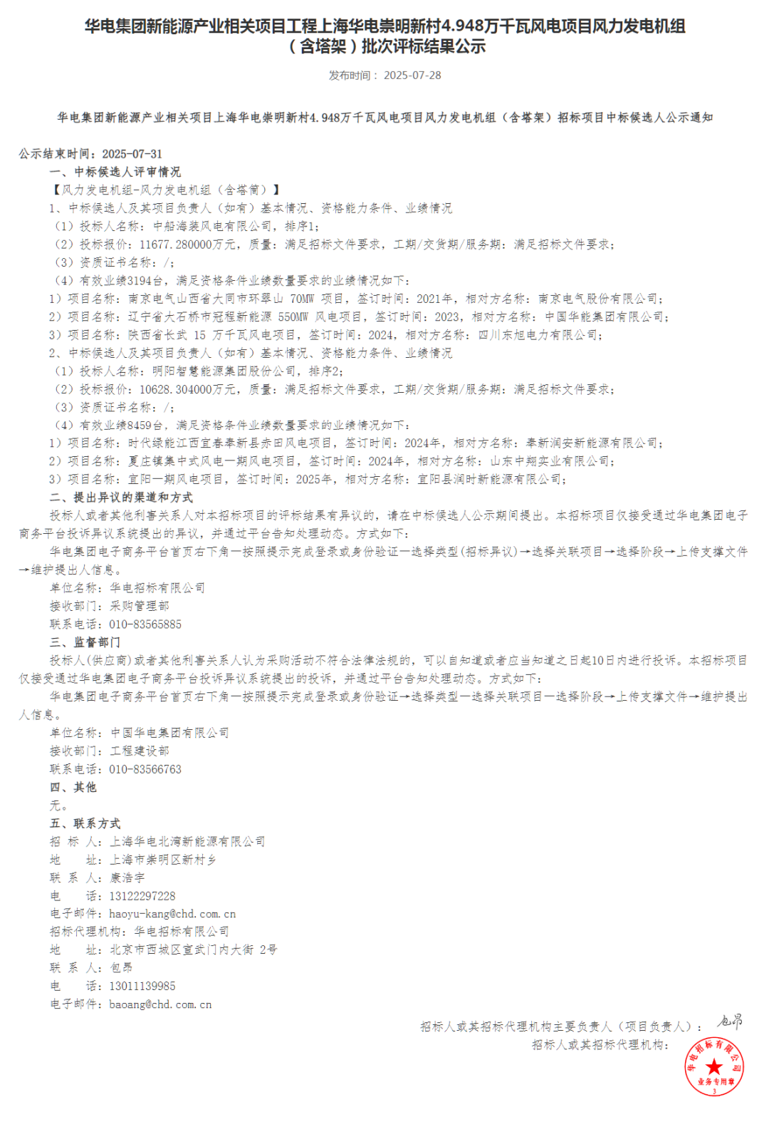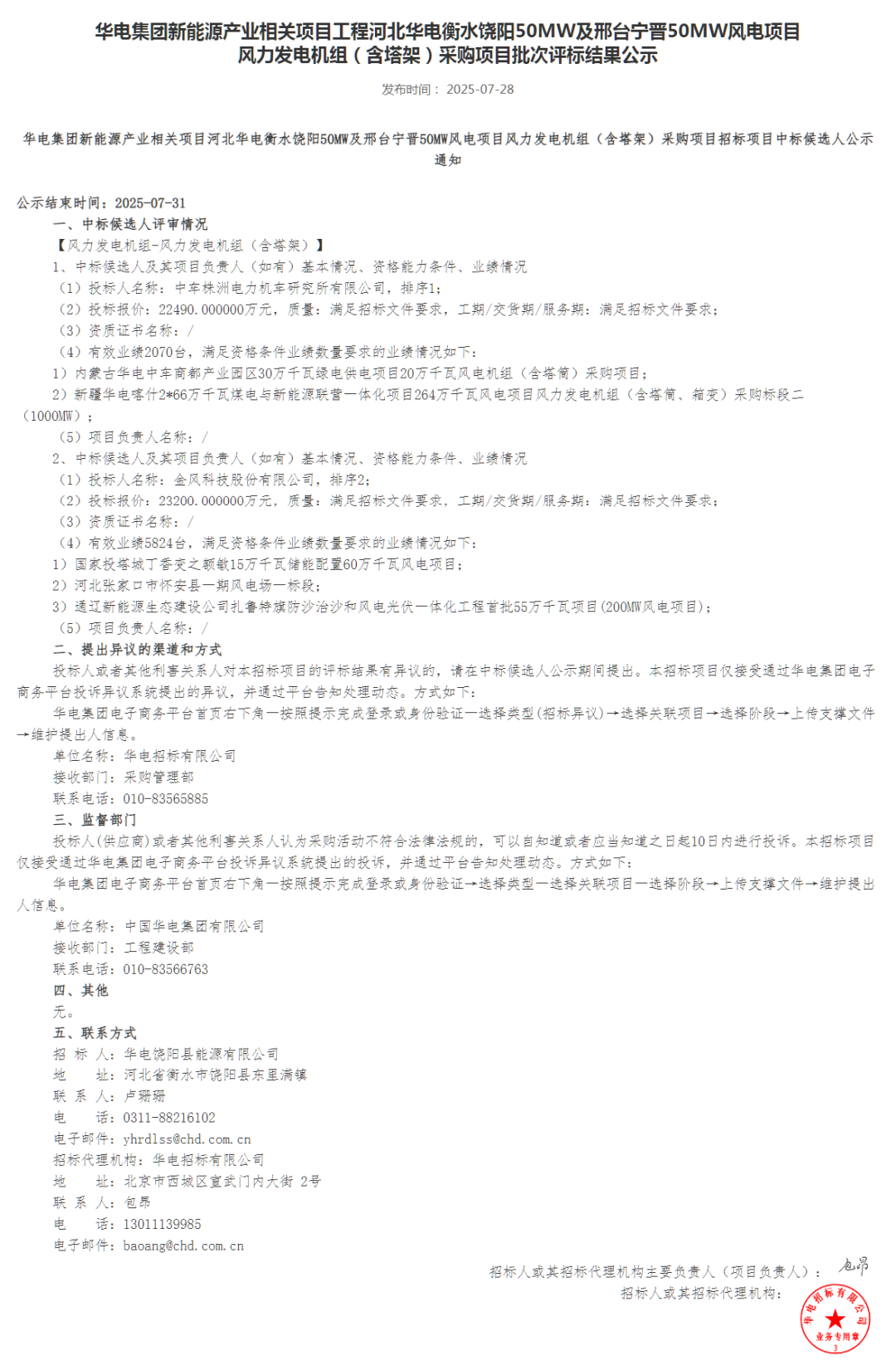 根据公示,东方风电、中车株洲所、中船海装、金风科技作为第一中标候选人预中标。
