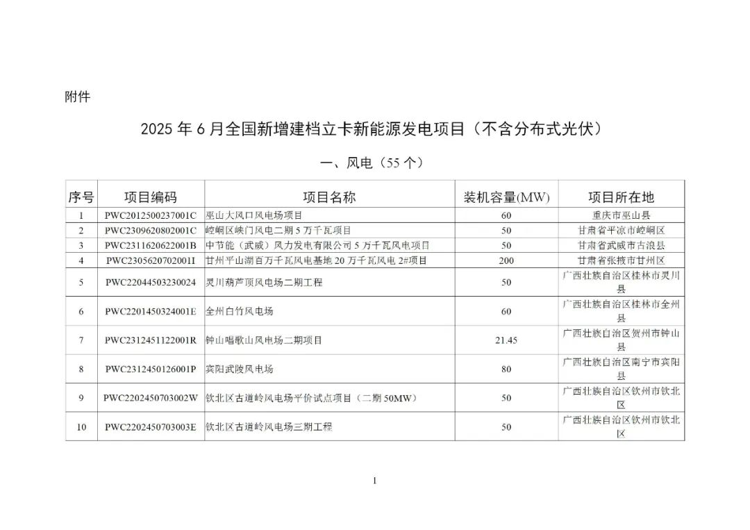 关于2025年6月全国新增建档立卡新能源发电(不含户用光伏)项目情况的公告