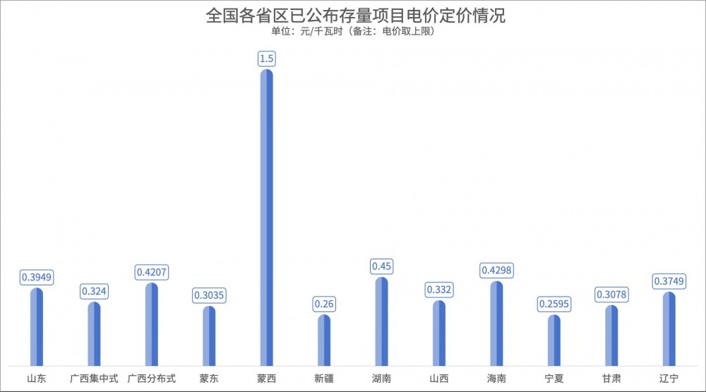 存量项目中,甘肃、宁夏、新疆三地价格较低,分别为0.3078元/千瓦时、0.2595元/千瓦时和0.26元/千瓦时。