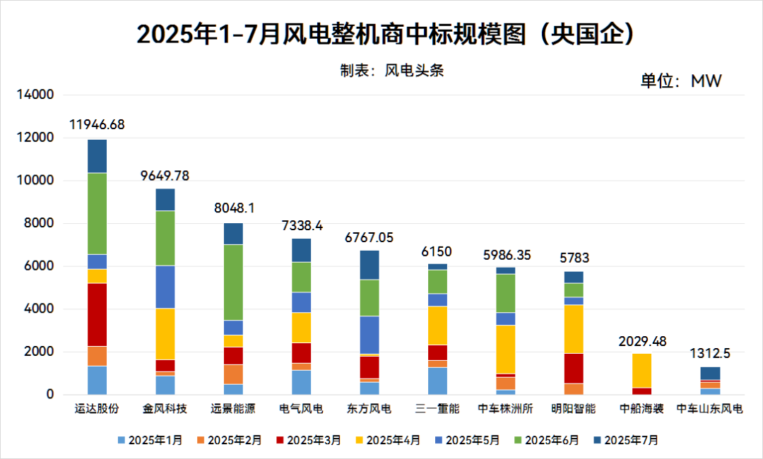 2025年1-7月央国企风电机组中标市场呈现如下趋势和特点: