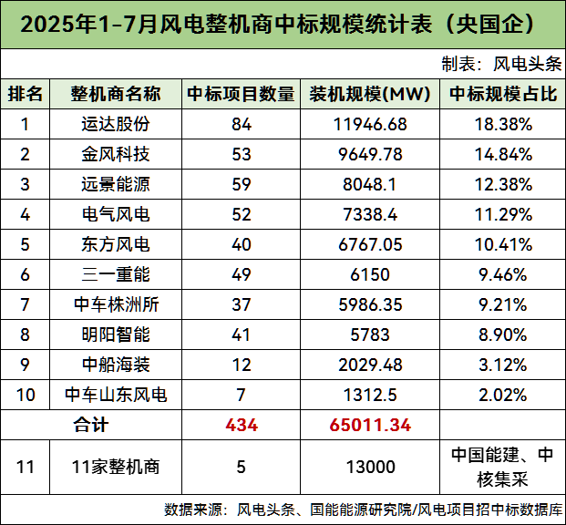 根据新能源圈风电项目数据库统计显示,2025年1-7月央国企风电项目共有10家整机商中标。其中,运达股份、金风科技、远景能源、电气风电、东方风电排前五名,累计中标规模达43.75GW,占中标总量的67.3%。(注:不含未公布具体规模的框采项目)