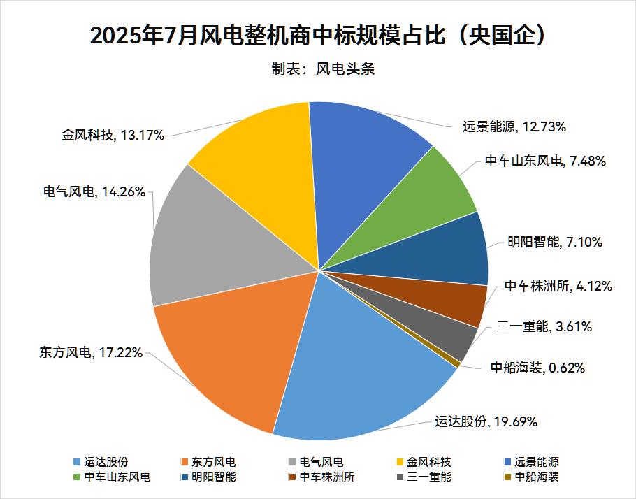 根据新能源圈风电项目数据库统计显示,2025年7月央国企风电项目共有10家整机商中标。其中,运达股份、东方风电、电气风电、金风科技、远景能源排前五名,累计中标规模达6183.8MW,占中标总量的77.07%。(注:不含未公布具体规模的框采项目)