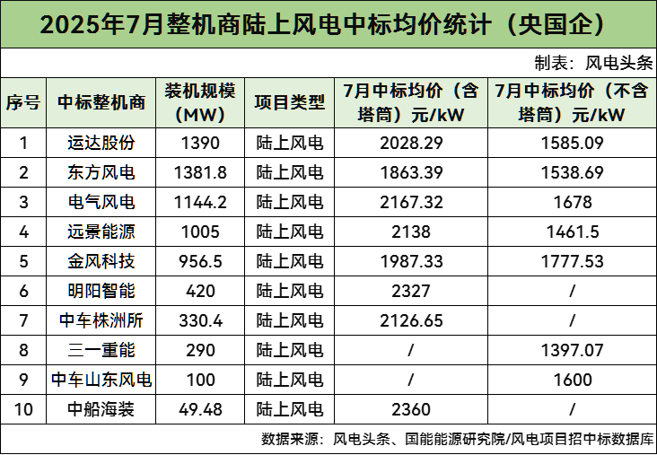 2025年7月,陆上风电项目各整机商中,含塔筒最高中标均价为中船海装2360元/kW,最低中标均价为东方风电1863.39元/kW;不含塔筒最高中标均价为金风科技1777.53元/kW,最低中标均价为三一重能1397.07元/kW。(注:仅统计公开订单规模及价格的风电项目)