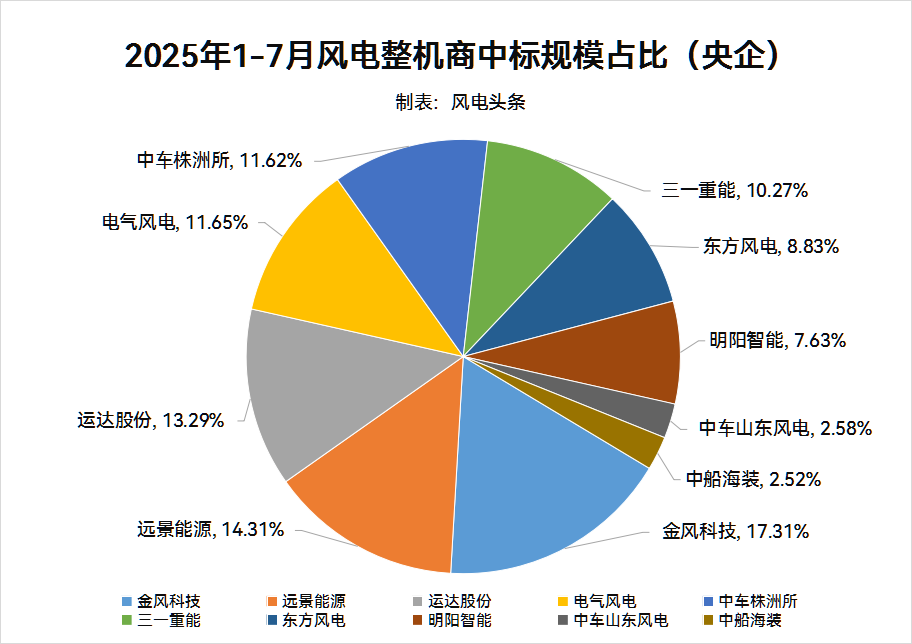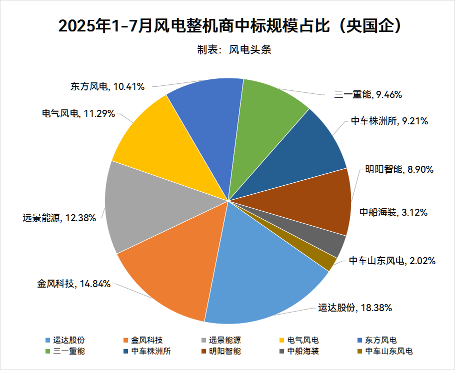 2、从整机商中标情况来看,2025年1-7月,中标央国企整机规模最大的五家整机商分别为运达股份、金风科技、远景能源、电气风电、东方风电,占比分别为18.38%、14.84%、12.38%、11.29%、10.41%。这5家整机商共中标43.75GW,占总中标容量的67.3%,整机商市场品牌集中度高。(注:不含未公布具体规模的框采项目)