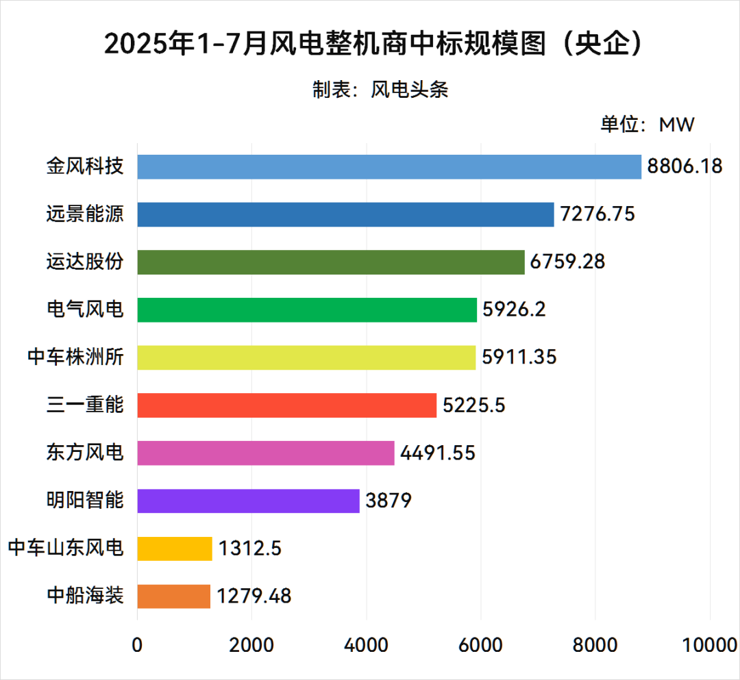 2025年1-7月央企风电项目共有10家整机商中标,其中,金风科技、远景能源、运达股份、电气风电、中车株洲所排前五名,累计中标规模达34.68GW,占中标总量的68.18%。(注:不含未公布具体规模的框采项目)