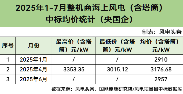 2025年1-7月,央国企开标海上风电项目5510MW,其中3050MW海上风电项目公示中标价格。(注:仅统计公开订单规模及价格的风电项目、无海上风电不含塔筒项目开标)