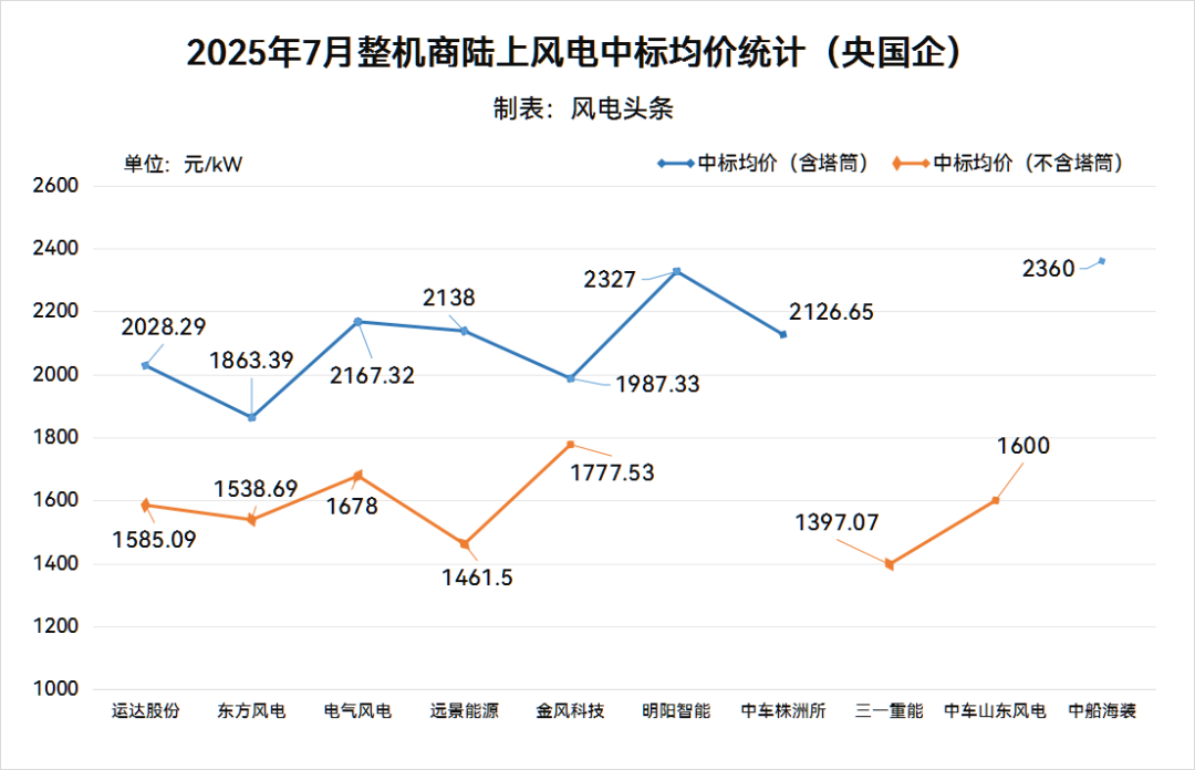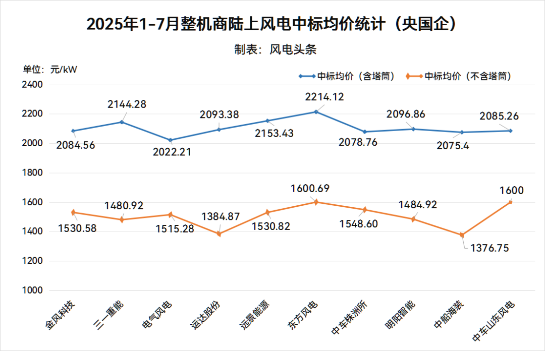 其中,7月陆上风电(含塔筒)均价2116.31元/kW,最低中标单价1695元/kW,最高中标单价2595元/kW;