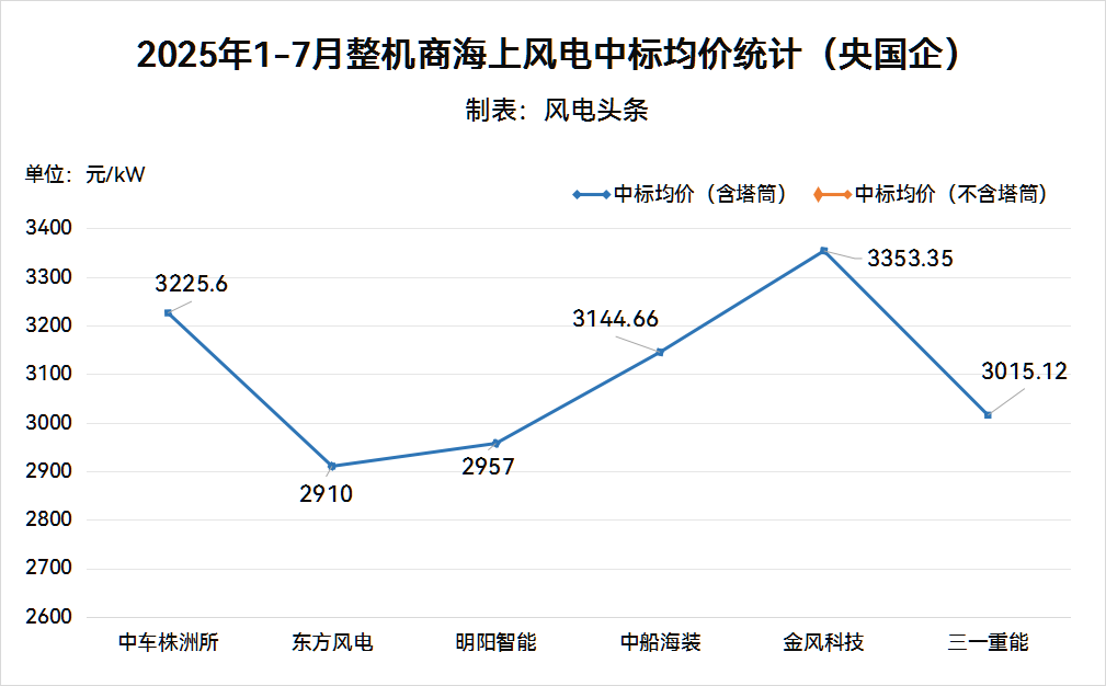 海上风电项目各整机商中,含塔筒最高中标均价为金风科技3353.35元/kW,最低中标均价为东方风电2910元/kW。(注:仅统计公开订单规模及价格的风电项目)