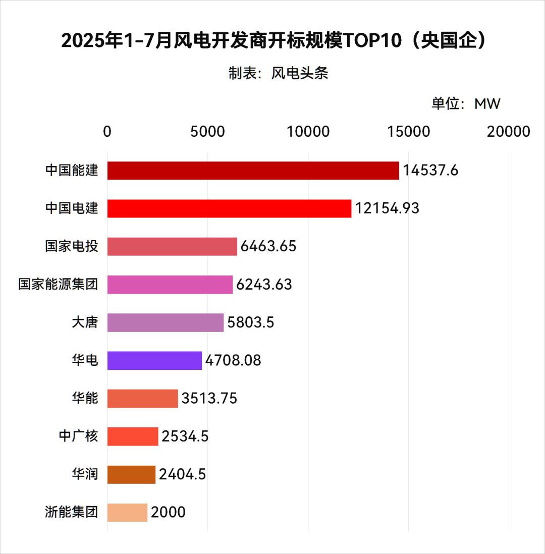 4、从开发商角度来看,2025年1-7月,央企风机开标容量为63.87GW,占比为81.87%,国企风机开标容量为14.14GW,占比18.13%。其中,央国企总排名中,中国能建开标容量领先第一,开标容量达14.54GW,其次是中国电建,开标容量达12.15GW,随后是国家电投,开标容量达6.46GW。
