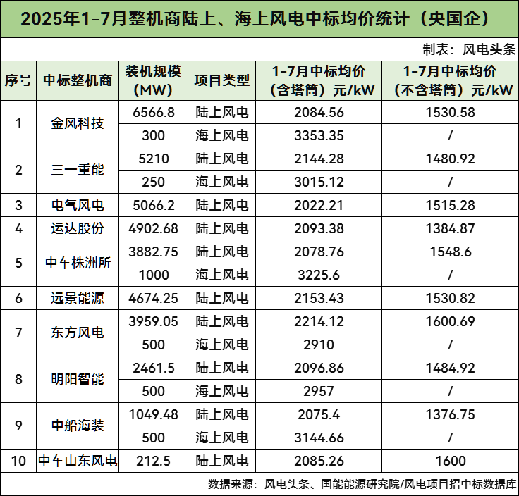 2025年1-7月各整机商陆上、海上风电中标均价统计